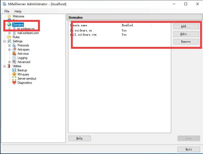 2.添加域名,域名后面介绍如何配置,这个域名为MX记录的域名,也是你邮件地址后缀的名字,如xxx@mail.xxx.com,这里的域名填写的就是mail.xxx.com,至于如何配置个mail.xxx.com记录待会说。