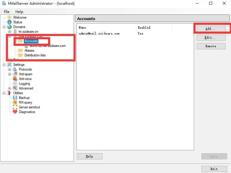 3.配置好之后就可以添加邮箱的用户账号了,点击添加好的域名下的【Accounts】,右侧点击添加,输入用户名和密码,点保存即可。